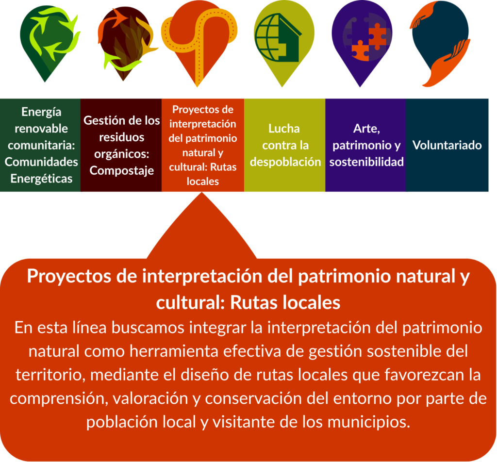 En esta línea buscamos integrar la interpretación del patrimonio natural como herramienta efectiva de gestión sostenible del territorio, mediante el diseño de rutas locales que favorezcan la comprensión, valoración y conservación del entorno por parte de población local y visitante de los municipios.